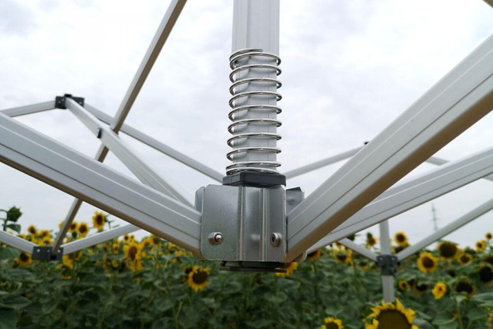 Tämän teltan sydän on sen rakenne korkealaatuisesta eloksoidusta alumiinista, jonka sisäinen seinämän paksuus on alkaen 1,8 mm. Tämä parametri varmistaa, että teltta ei liiku edes todella voimakkaassa tuulessa! Katon 1,8 mm paksut saksiprofiilit on lisäksi ammattimaisesti vahvistettu ja kaikkein rasitetuimmissa kohdissa niitä on vahvistettu entisestään maksimaalisen käyttöiän saavuttamiseksi. Koko rakenne on täysin alumiinia ja sen jalat on muotoiltu innovatiivisesti kuusikulmion muotoon, mikä moninkertaistaa koko teltan kokonaislujuuden, vääntöjäykkyyden ja vakauden verrattuna tavallisiin profiileihin.