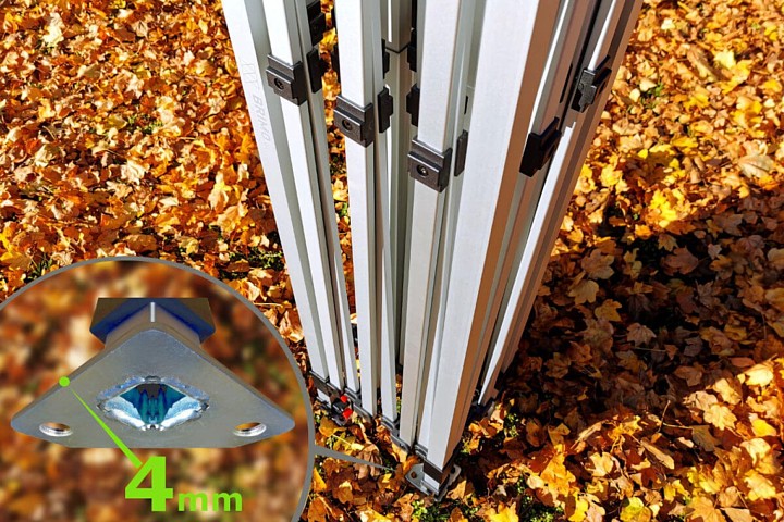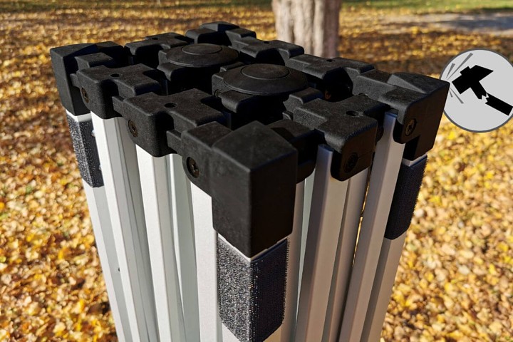Promootioteltta kestää rohkeasti sääolosuhteita. Teltta seisoo tukevilla jaloilla, joissa on paksut jalustat. Jokaisessa jalustassa on kaksi reikää teltan nopeaa kiinnittämistä varten. Teltta on aina kiinnitettävä. Pakkaus sisältää kiinnitystapit. Nopea katos, erinomainen esittely, helppo kuljetus – näin tiivistäisimme suosituimman myyntiteltan.