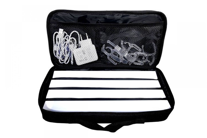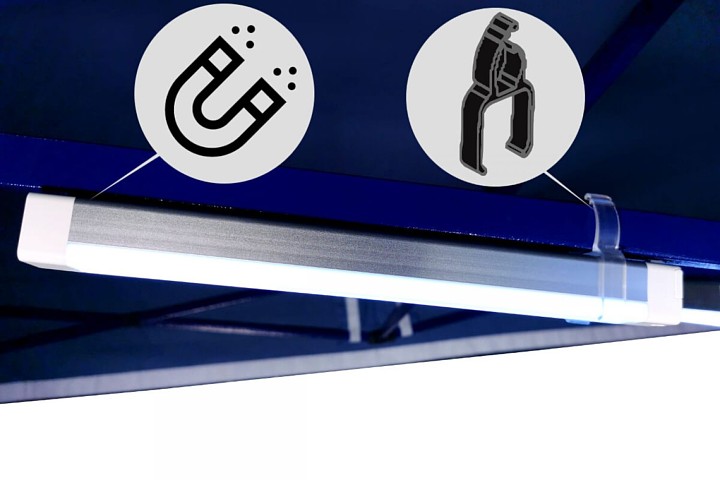 LED-valaistuksen mukana tulee käytännöllinen kantokassi sekä magneettikiinnikkeet ja muoviklipsit. Olemme varmoja, että käytät valaistusta paitsi teltassa, myös apuna eri töissä kotona.