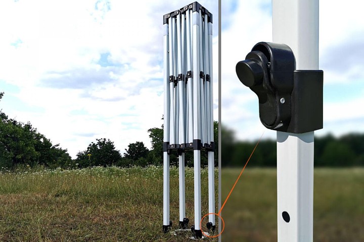 Nopea kokoaminen ja ajan säästö ovat tärkeitä. Automaattisen järjestelmän ansiosta et tarvitse enää työkaluja teltan pystyttämiseen. Muutama vaihe ja teltta on valmis myyntiin. Jokainen osa on vaihdettavissa ruuviliitosten ansiosta. Tämä on hyödyllistä, jos runko vahingoittuu – ei tarvitse ostaa uutta telttaa, vaan pelkästään korvata rikkoutunut osa. Ensimmäisen vuoden aikana annamme varaosat ilmaiseksi.
