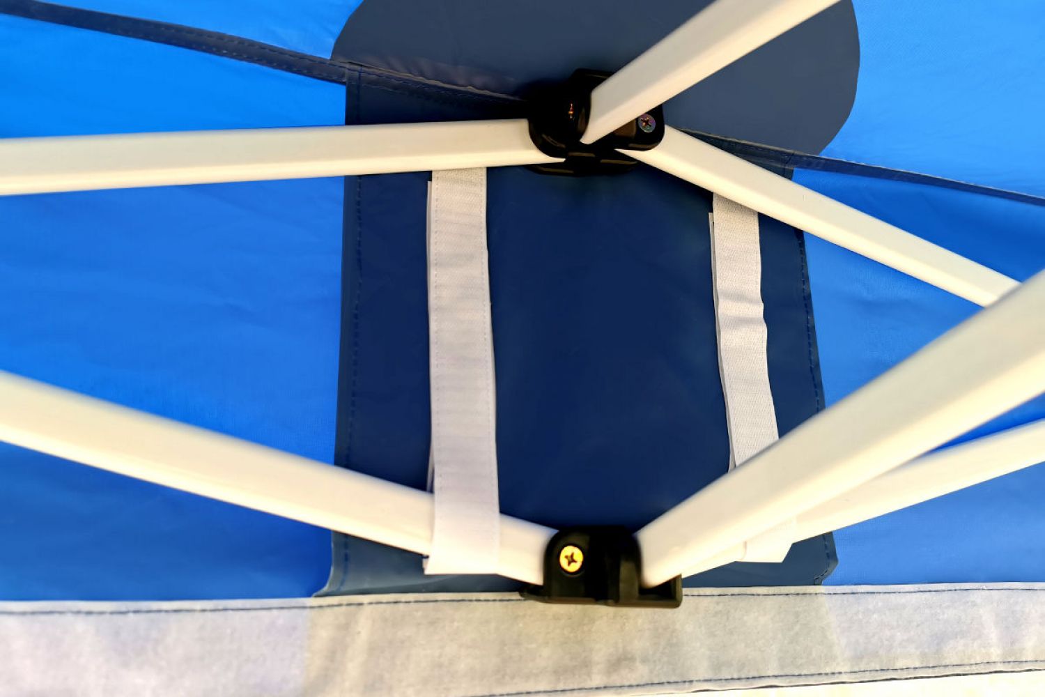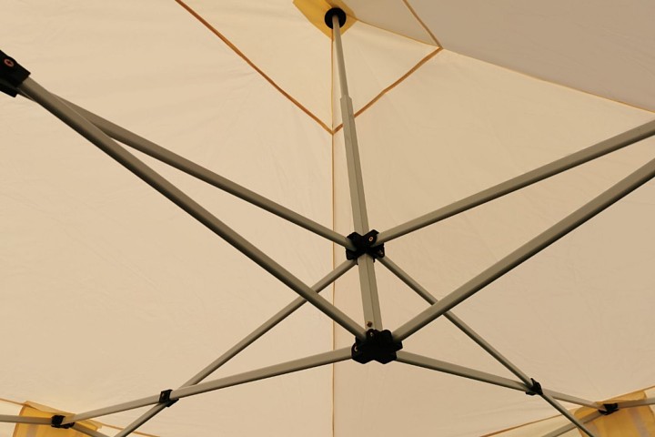 Paksu polyesterikangas on katoksen sydän. Katon sisäpuolella oleva PVC-kerros luo täydellisen varjon. Jokainen liitos on lisäksi vahvistettu, teltta on 100% vesitiivis. Juhlien teltta on myös ihanteellinen tuotteiden varastointiin messuilla. Jos kaikki tavarasi eivät mahdu esittelypaikoille, voit turvallisesti säilyttää ne viereisessä teltassa.