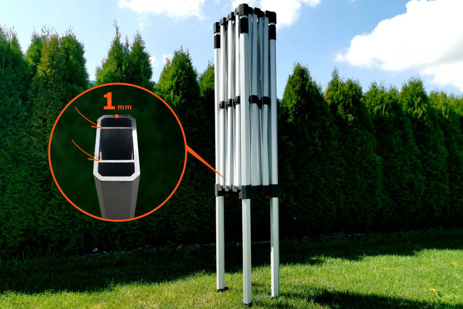 Unohda hauraat teräsputket. Paviljonkimme ydin on kuusikulmaiset (heksagonaaliset) alumiinijalat, jotka tarjoavat huomattavasti suuremman vääntöjäykkyyden kuin tavalliset neliöprofiilit. Anodisoitu alumiini on luonnostaan korroosionkestävä, mikä tarkoittaa, että telttasi näyttää uudelta jopa vuosien ulkokäytön jälkeen. Alumiinin keveyden ansiosta tämä malli on ihanteellinen kumppani myyntiedustajille, urheilujoukkueille ja näytteilleasettajille, jotka arvostavat helppoa käsittelyä ja kuljetusta tavallisen auton tavaratilassa.