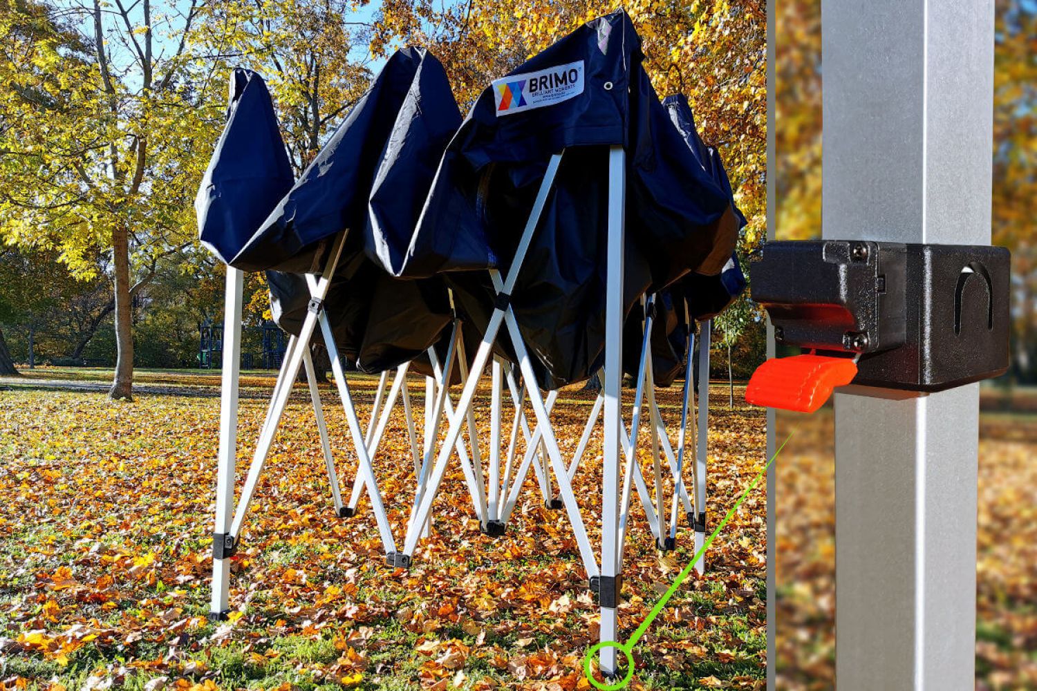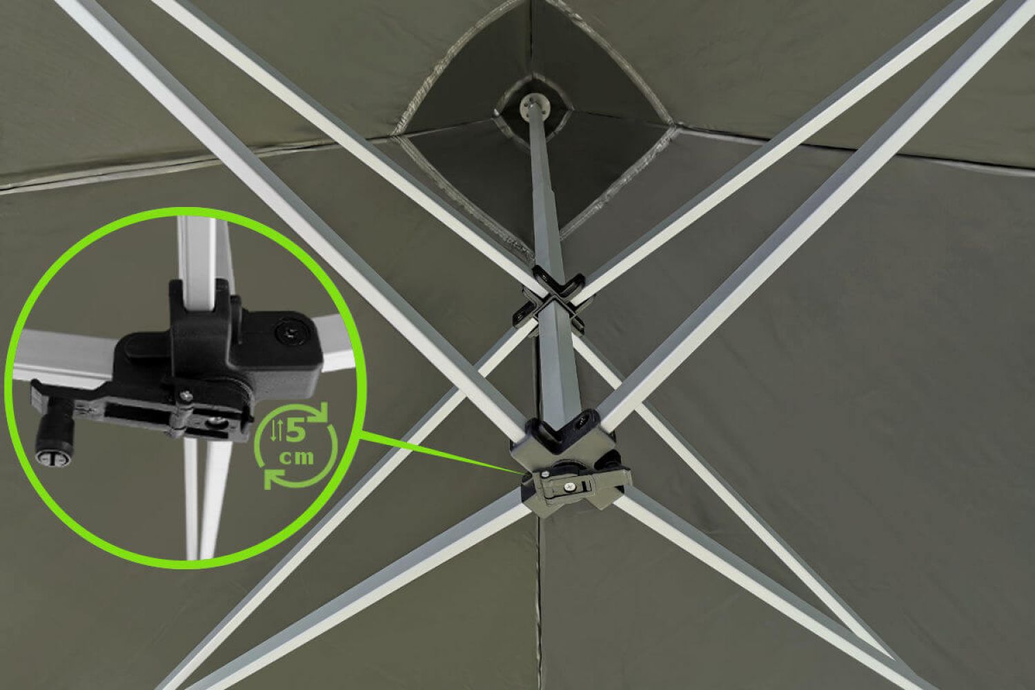 Promootioteltta kestää rohkeasti sääolosuhteita. Teltta seisoo tukevilla jaloilla, joissa on paksut jalustat. Jokaisessa jalustassa on kaksi reikää teltan nopeaa kiinnittämistä varten. Teltta on aina kiinnitettävä. Pakkaus sisältää kiinnitystapit. Nopea katos, erinomainen esittely, helppo kuljetus – näin tiivistäisimme suosituimman myyntiteltan.