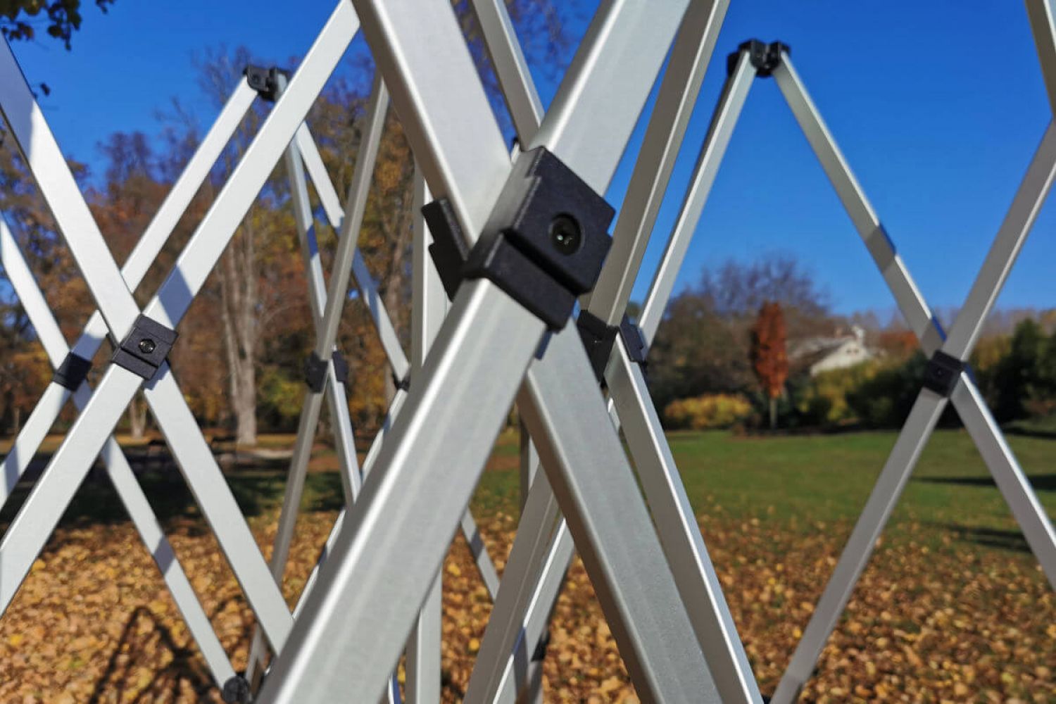 Yleisimmin käytetty materiaali on alumiini. Sillä on uskomattoman hyvät ominaisuudet, kevyt mutta erittäin kestävä ja luotettava. Kevyttä painoa arvostat, jos myyt usein teltan alla ja sinun täytyy siirtää sitä. Teltta pystytetään ja puretaan muutamassa sekunnissa.