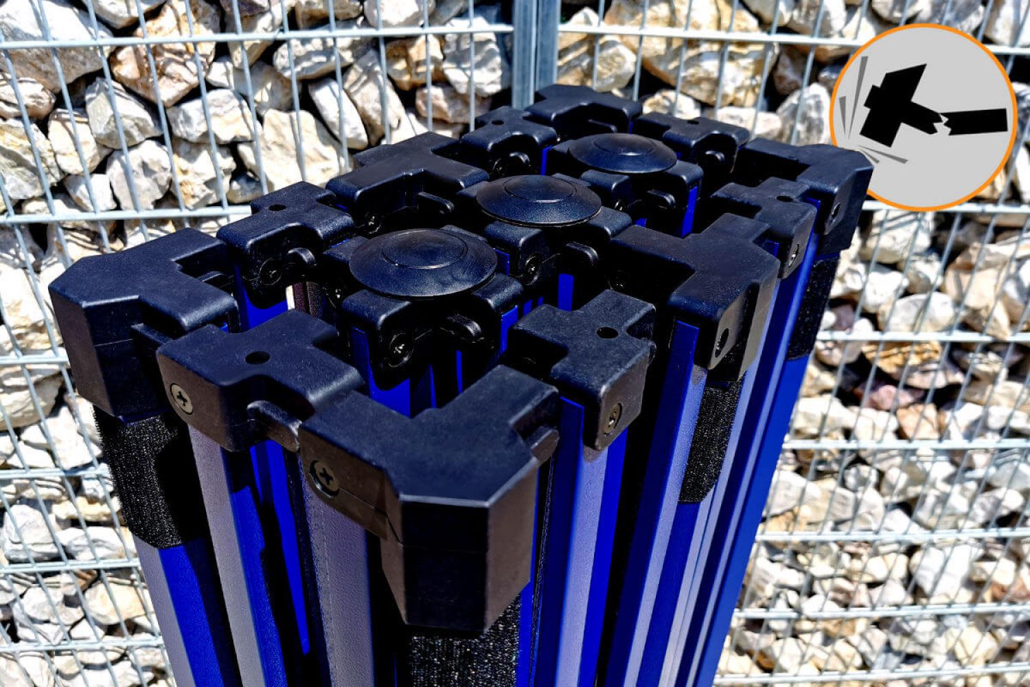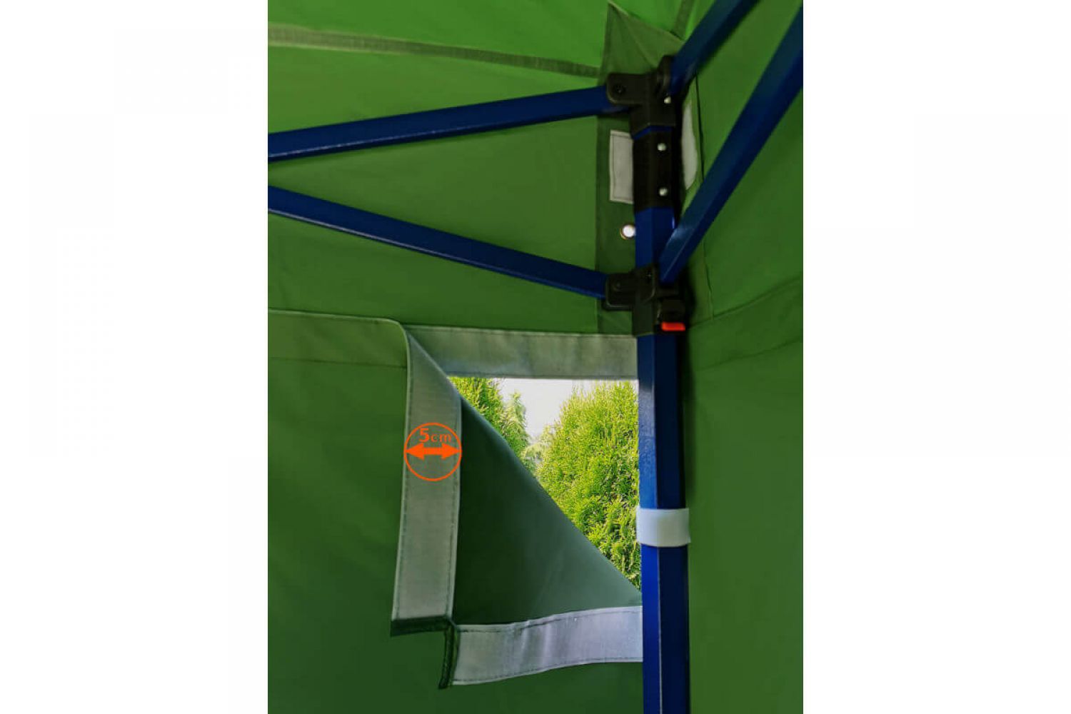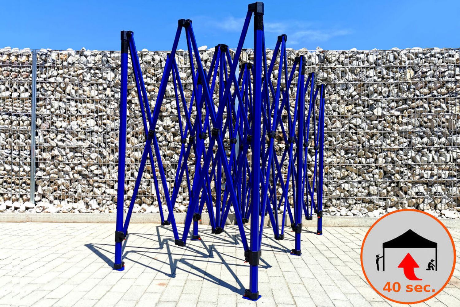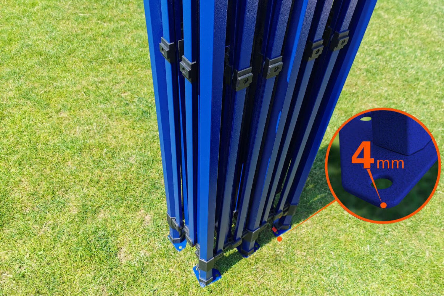 Rakenteen väri on kuninkaallinen sininen. Tämä väri antaa teltalle eksklusiivisen ilmeen. Se eroaa kilpailijoista, se on jotain uutta markkinoilla, jotain mitä kaikki haluavat. Uskomme, että jokainen yrittäjä haluaa erottua joukosta, ja siksi olemme lisänneet valikoimaamme tämän eksklusiivisen teltan, jossa on epätavallinen rakenneväri.